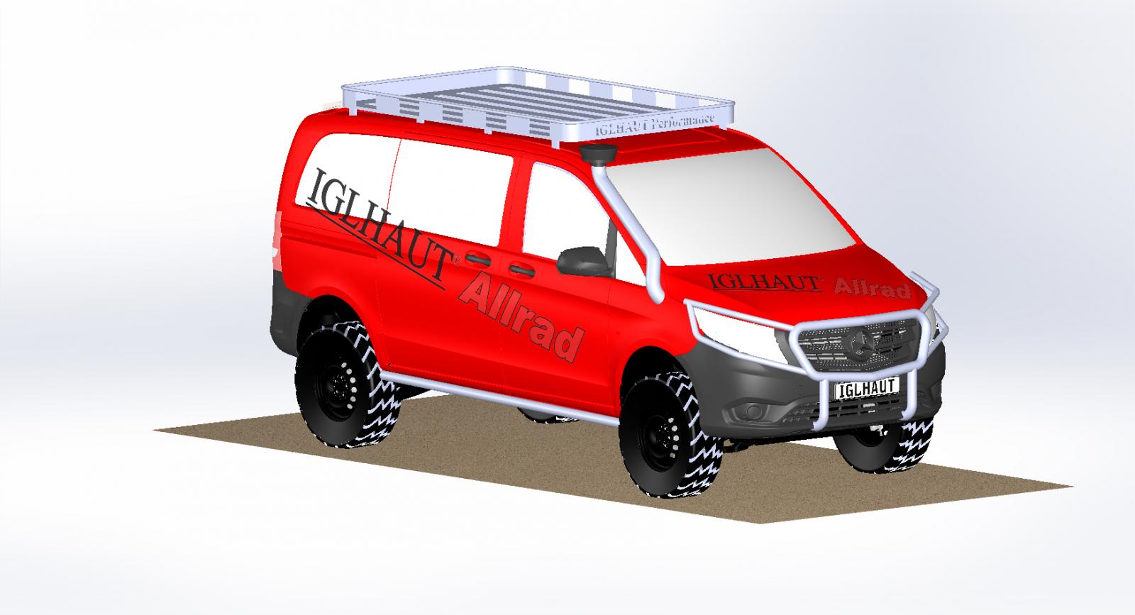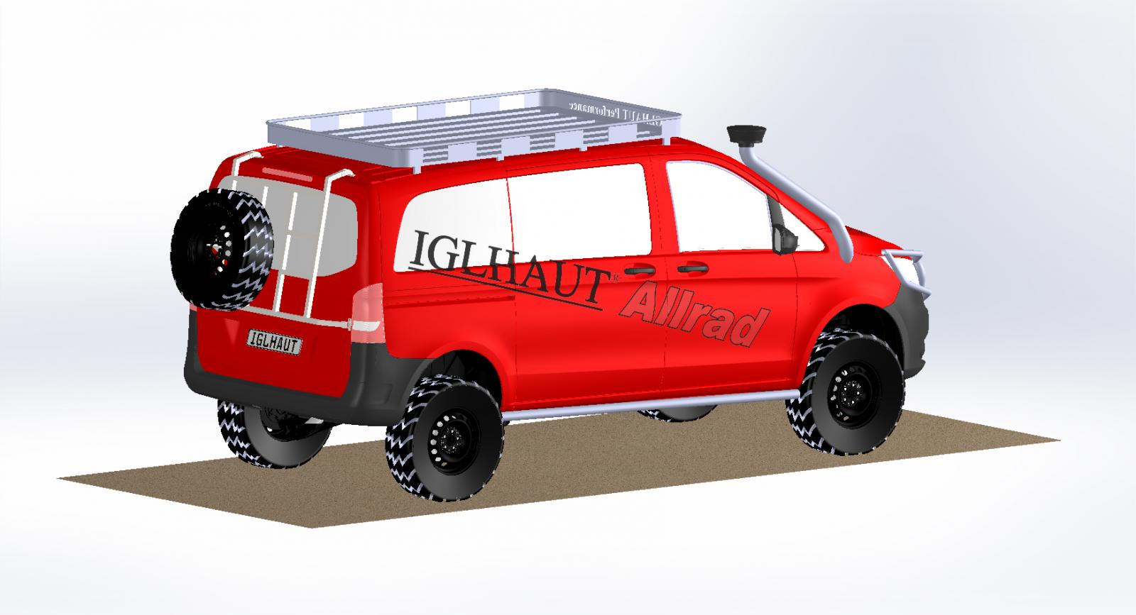 Inglhaut vybavil Vito aj Véčko permanentným pohonom všetkých kolies, žiadnym Haldexom ani ničím podobným, normálnou stálou štvorkolkou. Do balíka prihodil aj redukciu. Tri zamnkuteľné diferenciály, dvihnutý podvozok a kompletná ochrana spodku znamenajú, že zvládne viac ako väčšina SUV. Aby bol dojem dokonalý, rezervné koleso našlo miesto na zadných dveroch a na expedícii sa bude hodiť aj nosič na streche.