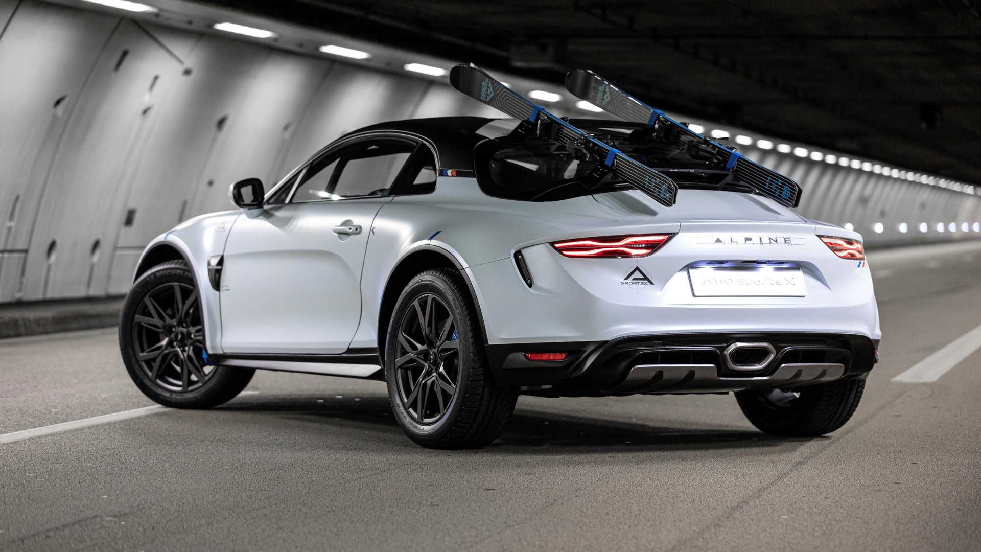 Táto nová podoba Alpinu je inšpirovaná rally verziou z roku 1973, ktorá zožala vavríny na slávnej Rally Monte Carlo. SportsX má oproti bežnému Alpinu podvozok zvýšený o 60mm a taktiež disponuje kompaktným nosičom lyží. Nové odolnejšie disky kolies sú zároveň širšie. Celková šírka auta tak vďaka nim narástla o slušných 80mm. Celková hmotnosť je iba 1098 kg, čo je jedna z hlavných výhod Alpinu ako takého. Ľahká zadokolka je snom mnohých šoférov. V tomto prípade je poháňaná 1.8 litrovým štvorvalcom s 248 koňmi a 320 Nm. Dvojspojkovú automackú prevodovku so siedmimi stupňami dodala firma Getrag. Dodajme, že na stovke je za približne 4,5 sekundy a maximálka je obmedzená na 250 km/h. Minimalistické, čierno-biele prevedenie s modrými detailami a brzdovými strmeňmi je krásne a jednoduché.