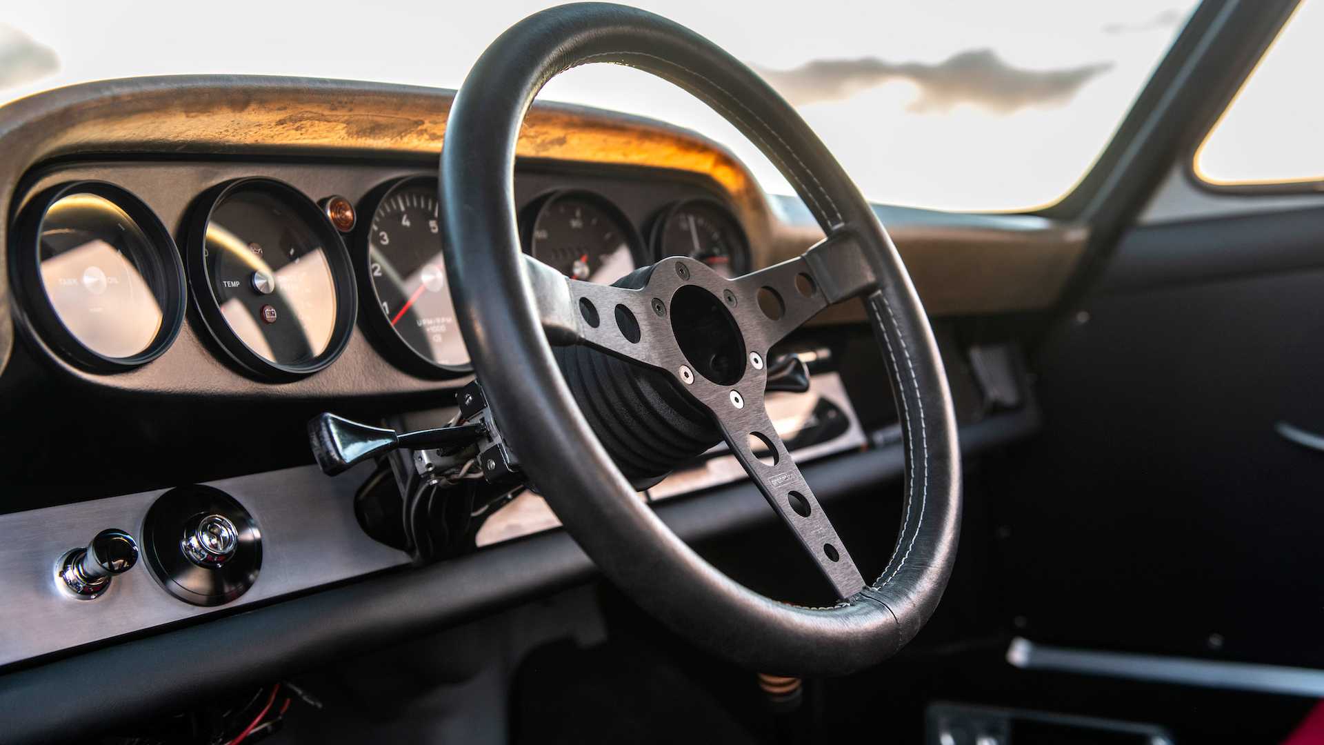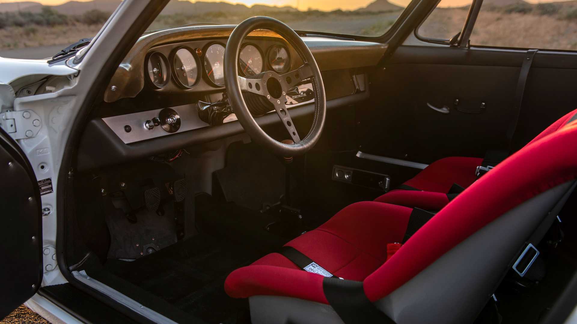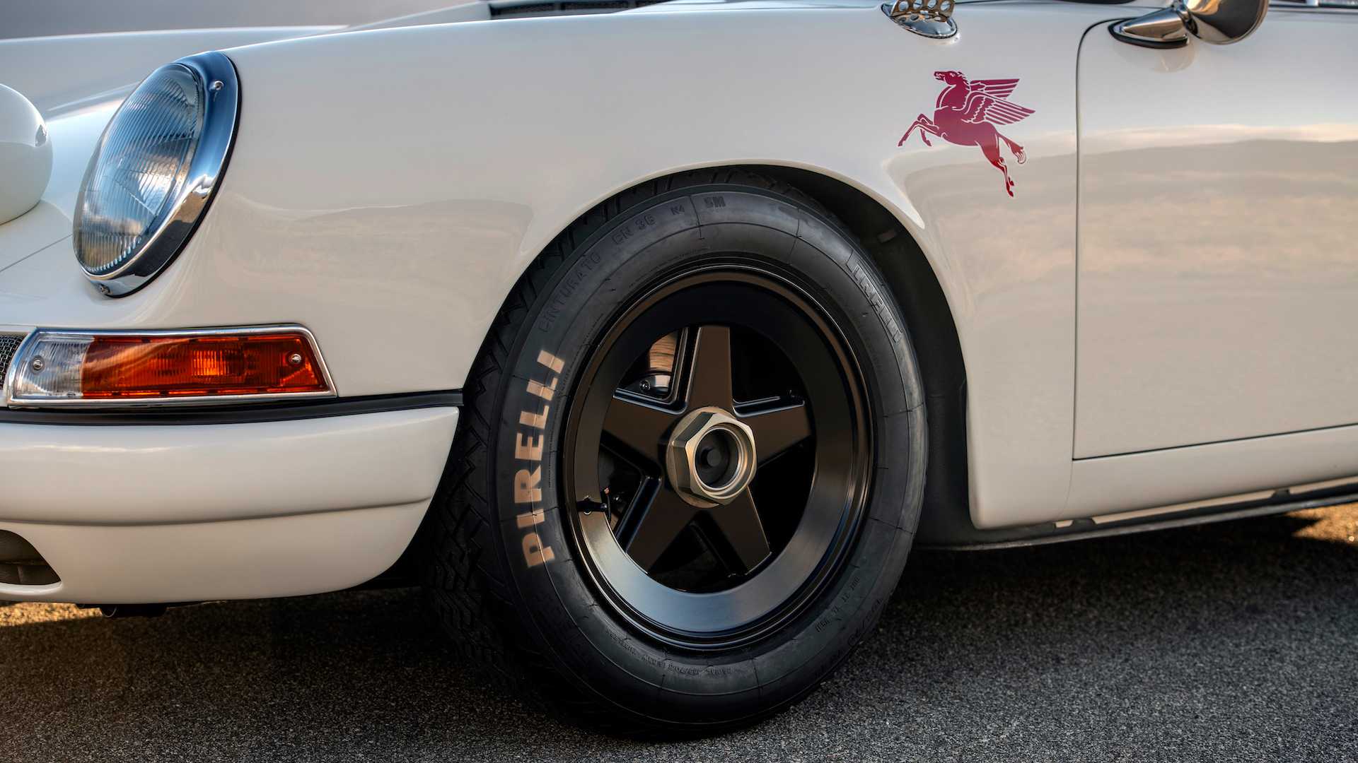 S citom spravený kúsok v bielej farbe, ktorú decentne dopĺňa oranžový obdĺžnik v prednej časti. Všimnite si aj červený klaksón v nárazníku a tiež okrídleného koňa na bokoch. Ide o Pegasa z loga olejárskej firmy Mobil. Klasické čierne päťlúčové disky sú stávkou na istotu. Na nich sú obuté slicky Pirelli CN36. Pri pohľade na dvojicu prídavných svetiel na kapote si spomeniete, že boli časy, keď Porsche jazdilo na vrcholovej úrovni rally. V interiéri sú krásne červená anatomické sedačky, ktoré by ale asi dnešnými homologačnými predpismi neprešli, keďže im chýba opierka hlavy. Vyzerajú ale úžasne a pripútanie do nich majú za úlohu päťbodové pásy MOMO. Malý trojramenný kožený volant je od Prototipo a za ním sú klasické jednoduché analógové ukazovatele prekryté drevenou kupolou.