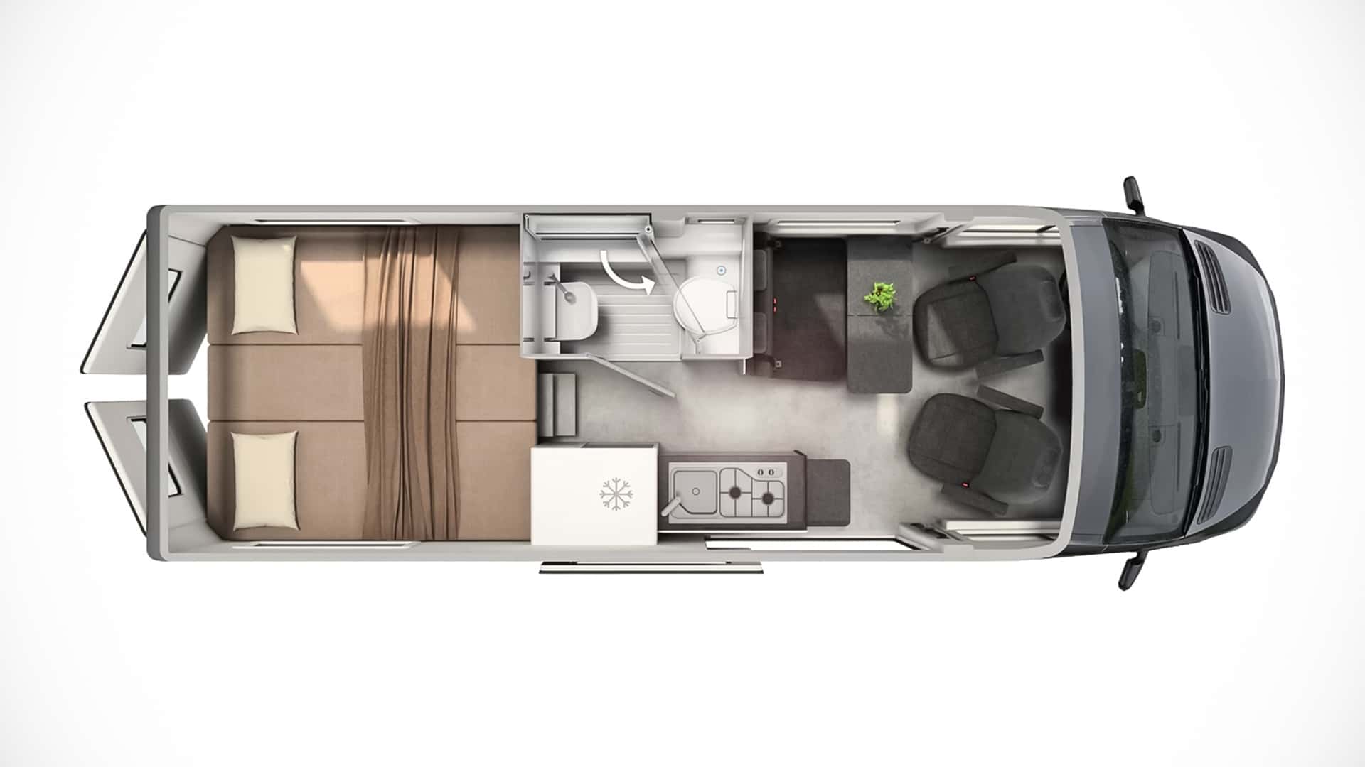Kúpeľňa je riešená ako variabilný modul, kde sa sprchovací priestor oddelí podľa potreby. Ide o riešenie známe z viacerých moderných vanov, no v sedemmetrovej karosérii pôsobí menej stiesnene. Otočné predné sedadlá spolu s rozkladacím stolom vytvárajú plnohodnotnú dennú zónu pre štyri osoby.