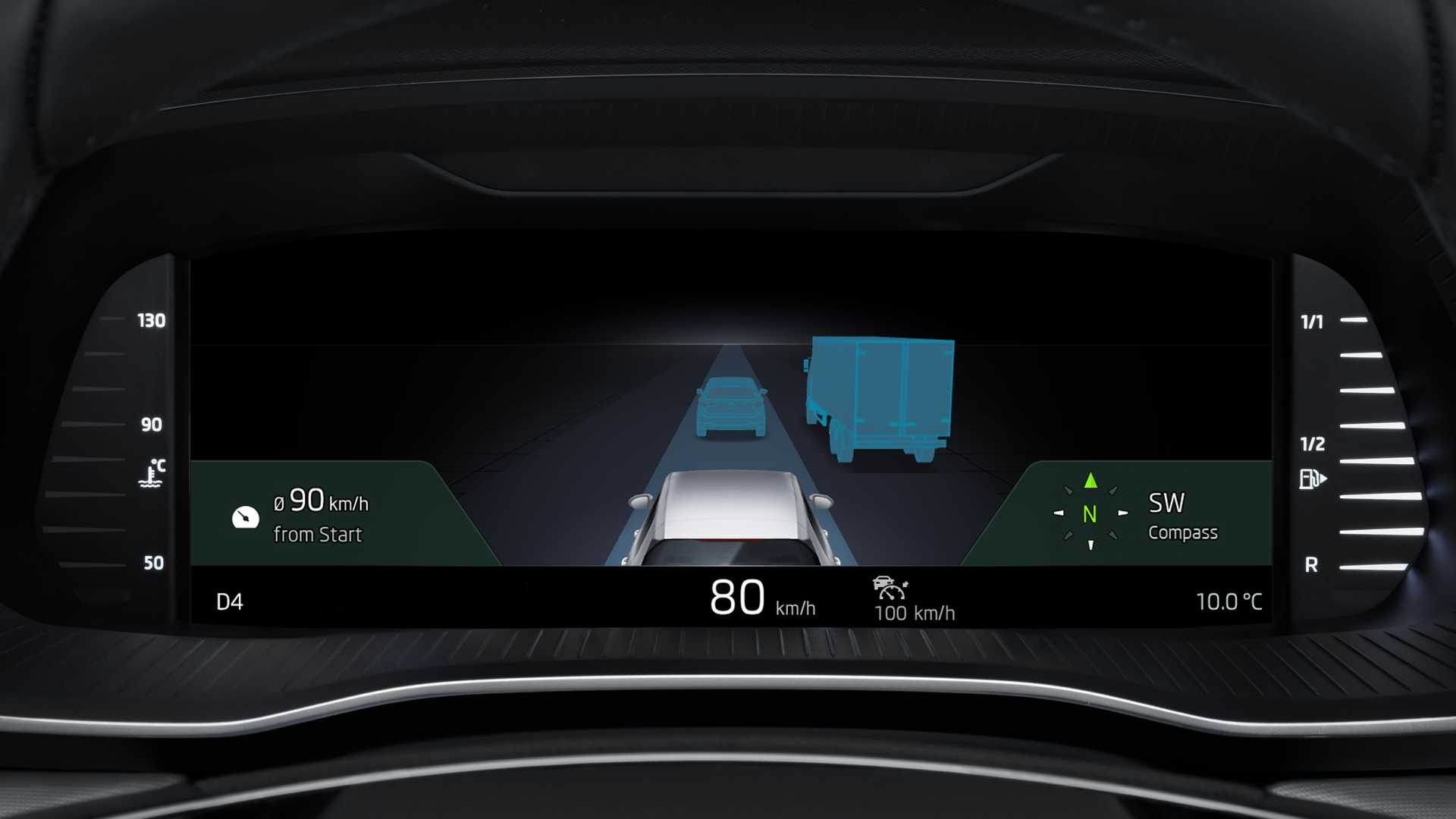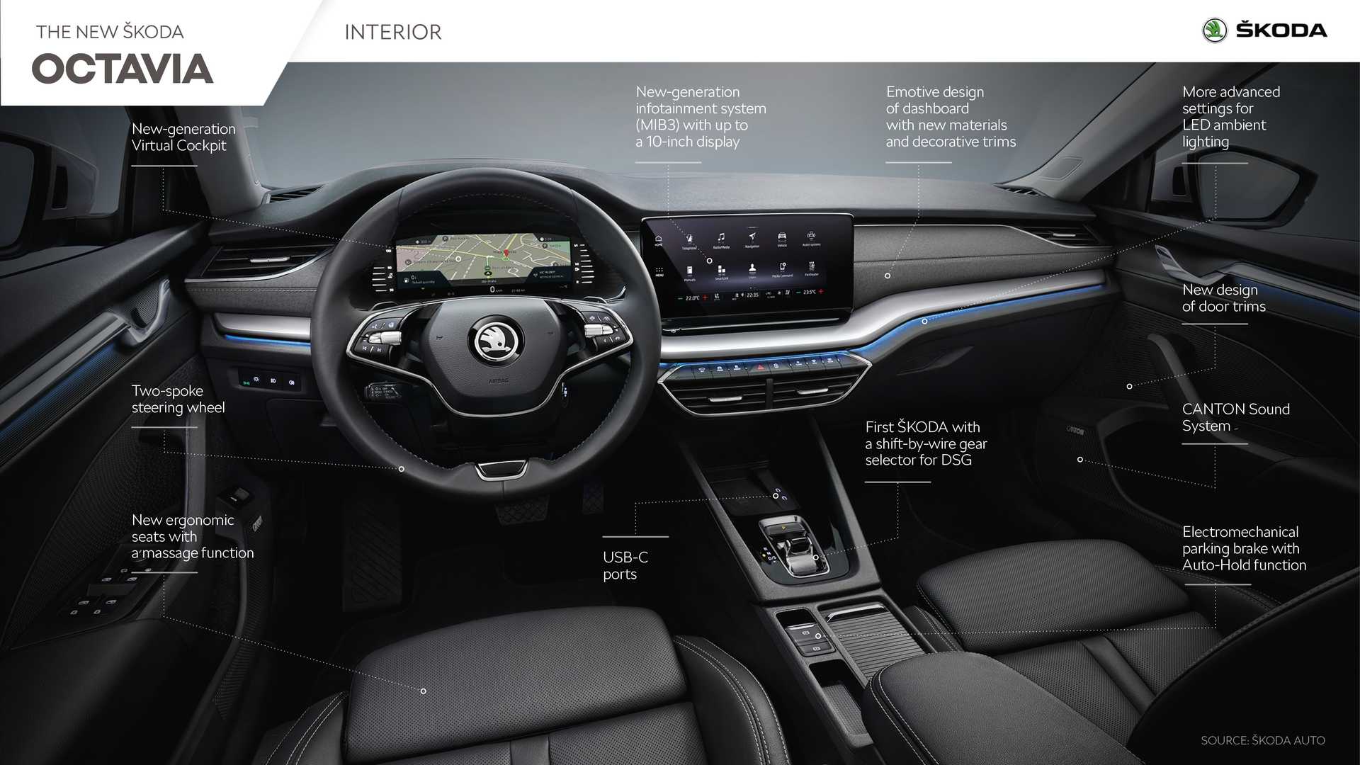Interér je minimalistický a veľmi úhľadne usporiadaný, nový dvojramenný volant bude ale určite vyvolávať diskusie. v strede je veľký 8.25 alebo 10″ displej infotainmentu pod ktorým sa tiahne zalomená obkladová lišta a dvojica širokých výduchov vzduchu. Niektoré detaily môžeme poznať zo Scaly, ako napríklad kľučky dverí. Prístrojovka je plne digitálna, displej má 10.25″.