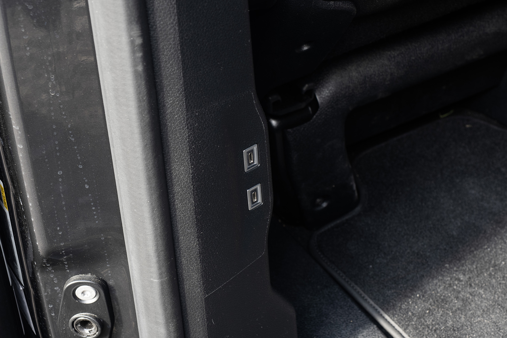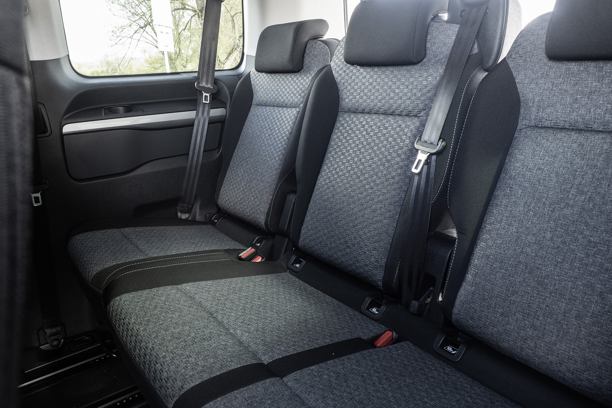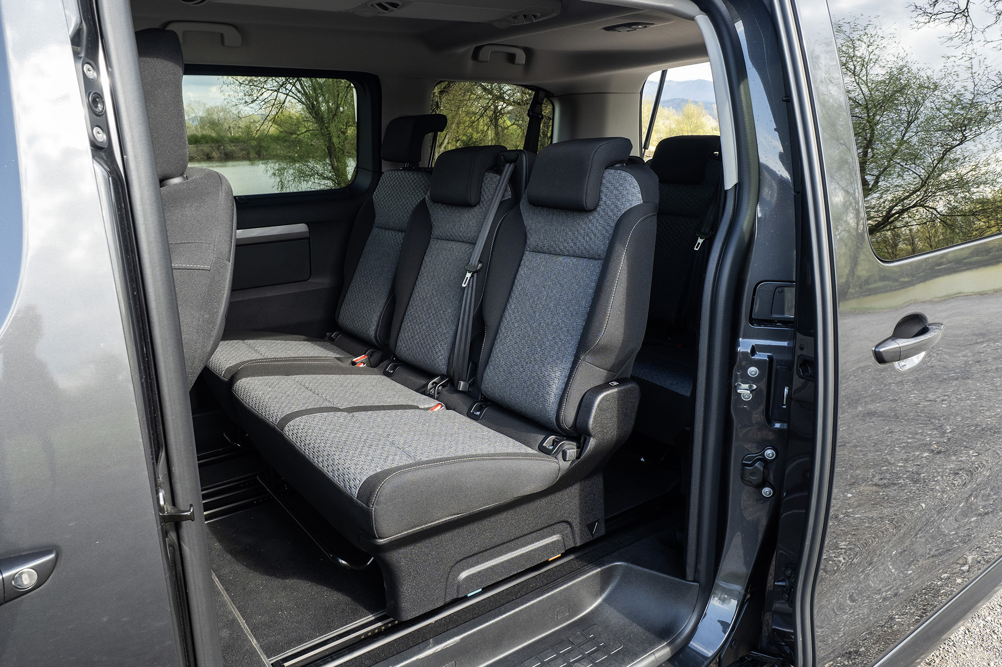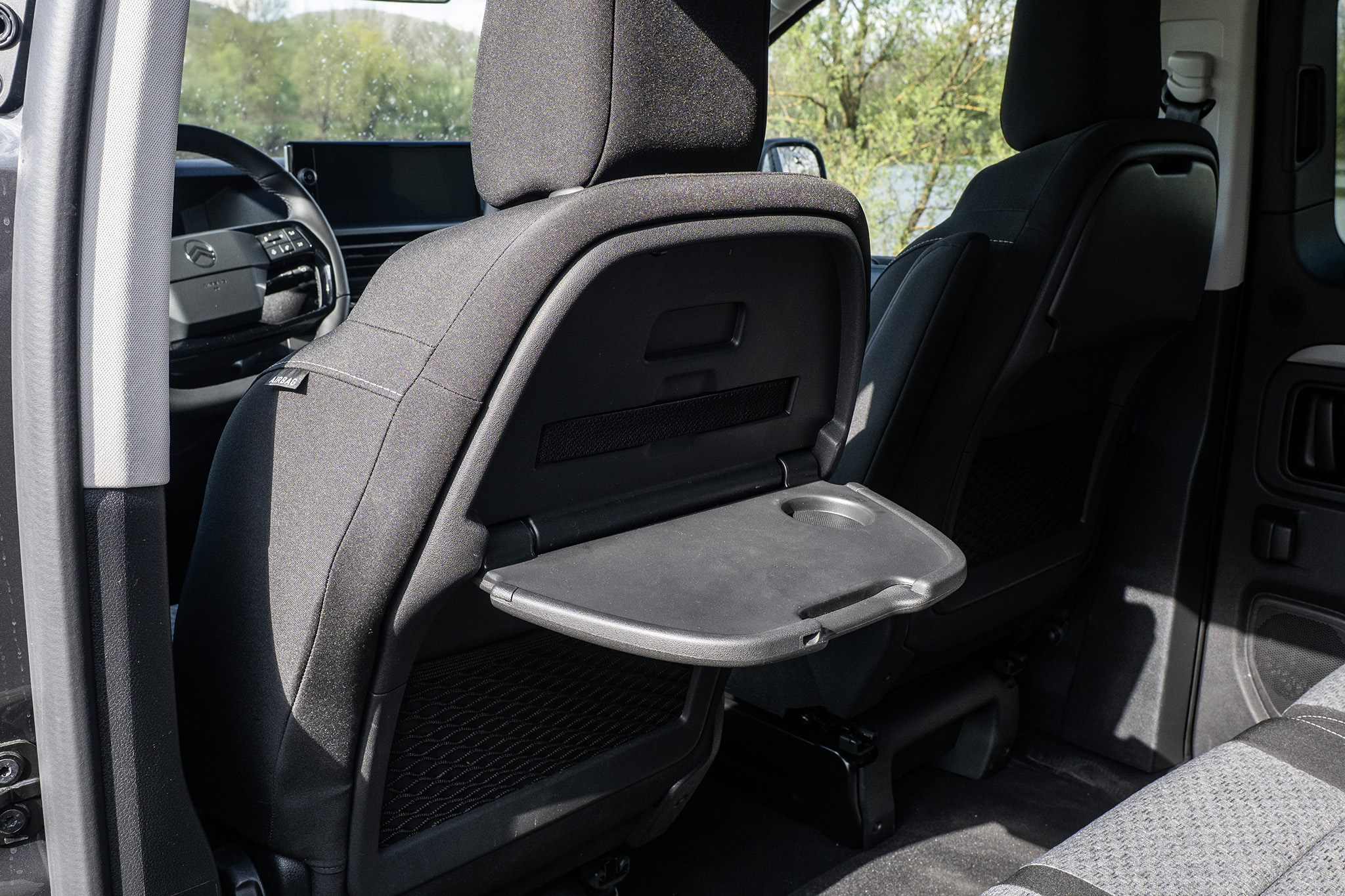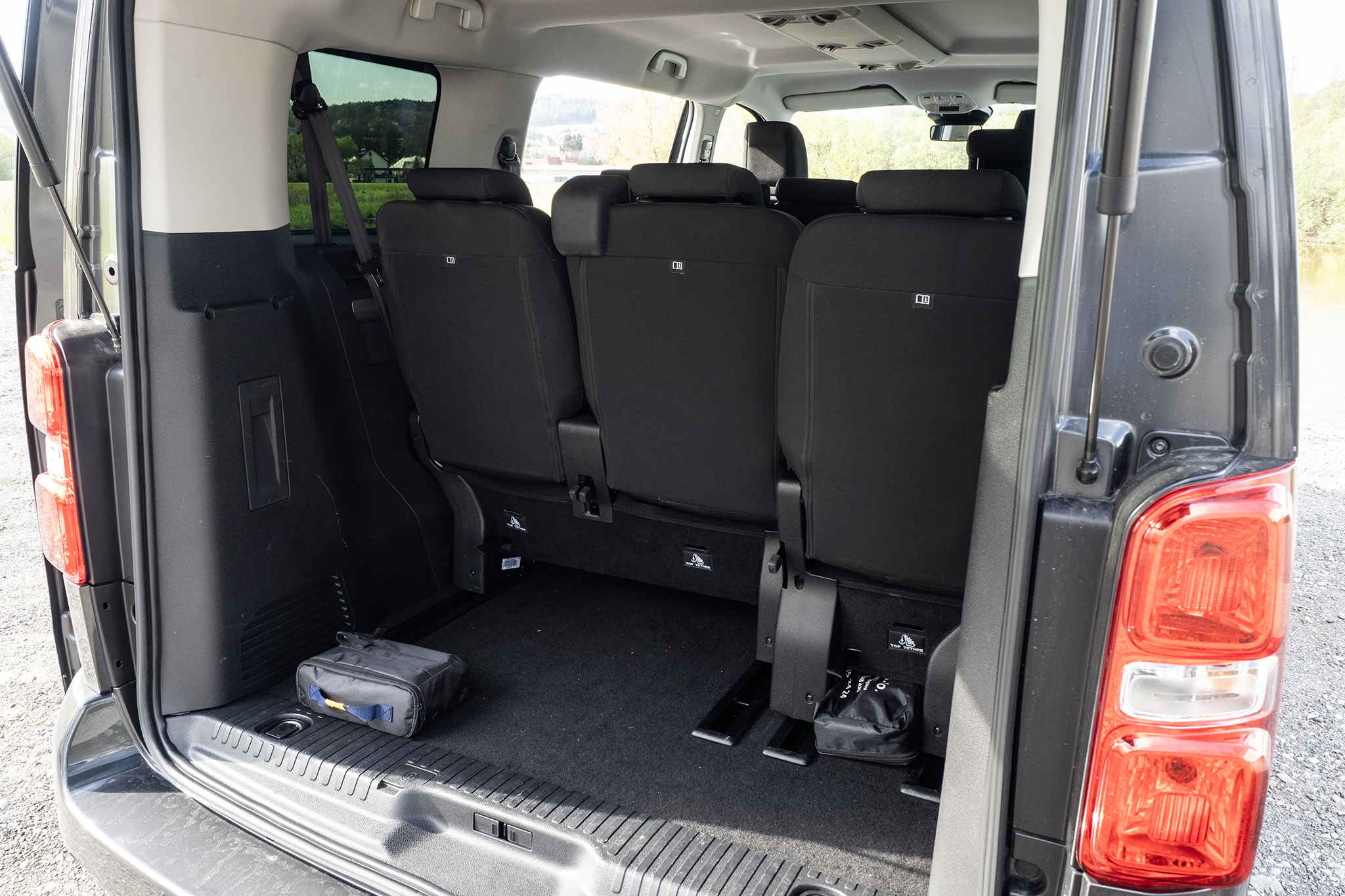 Prístup do tretieho radu je prirodzene obmedzený kvôli dvojlavici, no stále použiteľný. Najlepšie funguje cez pravé posuvné dvere po posunutí krajného samostatného sedadla v druhom rade. Vzadu nechýba 12V zásuvka ani držiak na dva nápoje. Praktické detaily, no potešili by aj vrecká na operadlách druhého radu. Hoci možno práve tam by sa po mesiaci našiel zabudnutý banán.