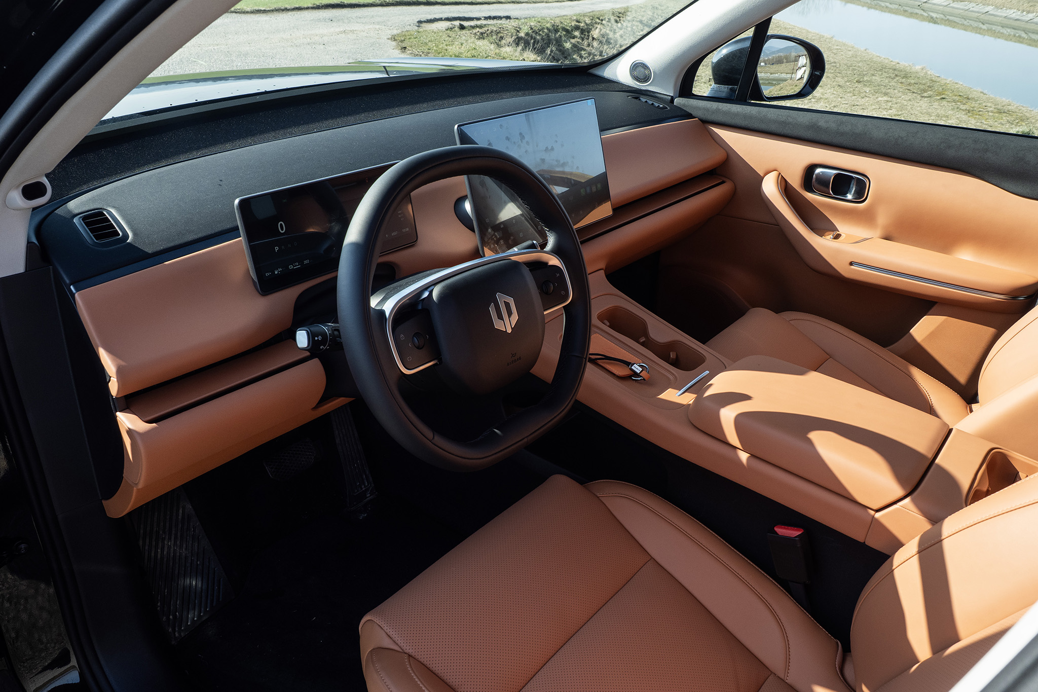 Prístrojová doska je stavaná horizontálne, pričom výduchy sú skryté v časti, ktorú automobilka označuje príbuznosťou s pianom. Dôležité je, že pred vodičom je displej s uhlopriečkou 10,25 palca, ktorý nápadne pripomína zase Nikolove menovecké vozidlá. Druhý displej má uhlopriečku až 14,6 palca a ovláda sa ním vlastne všetko ostatné.