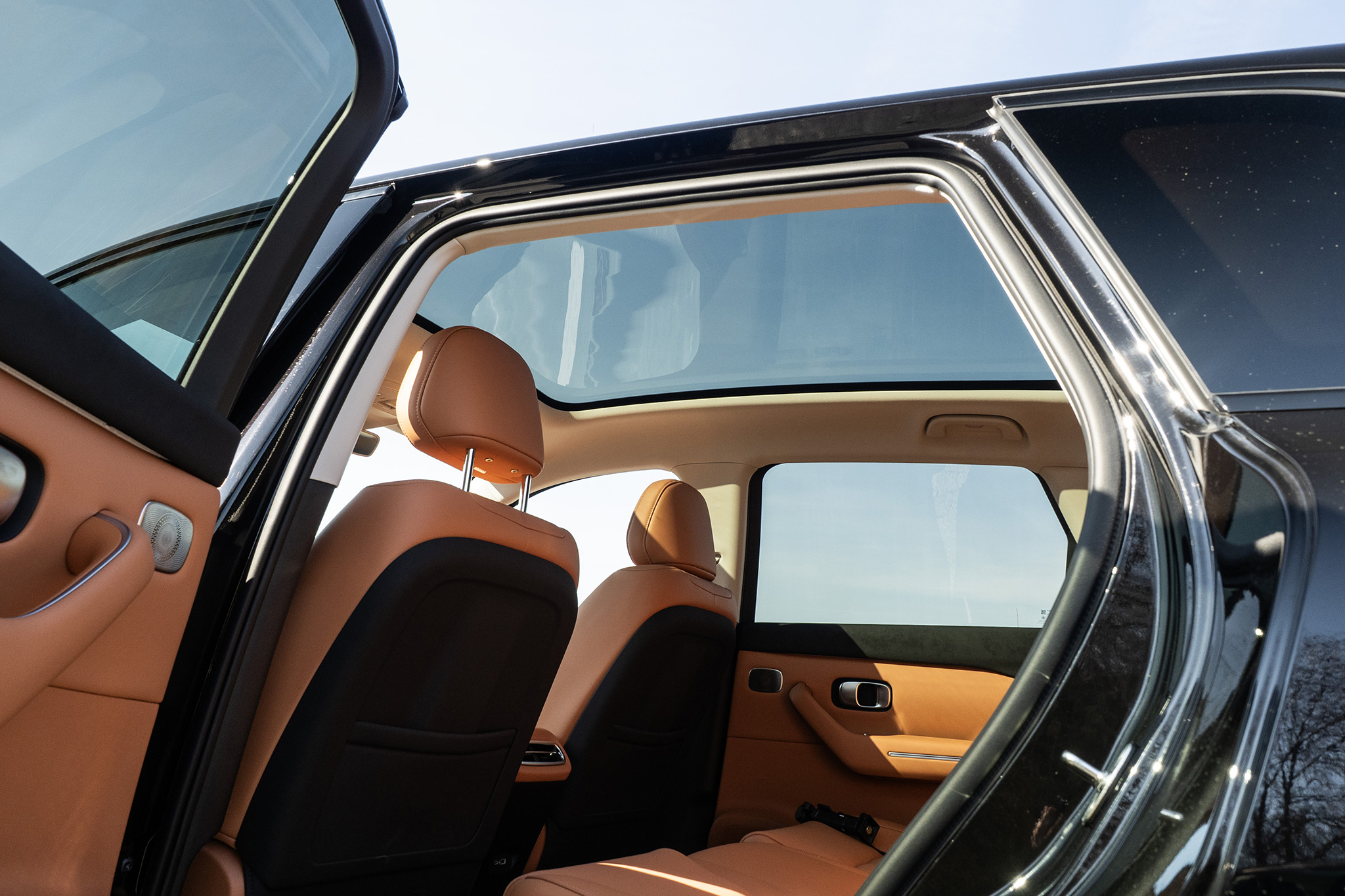Tým pádom sa zase presúvame na zadné sedadlá. Sú tu výduchy klimatizácie, ale tretiu zónu klimatizácie nehľadajte. Nie je nutná. Ale nutná je je roletka zakrývajúca panoramatické strešné okno s obrovským rozmerom. Roletka je elektricky ovládaná a reálne existuje. Naťahuje sa zo zadnej časti, ale je až tak vzadu, že nebráni hlavám pasažierov.