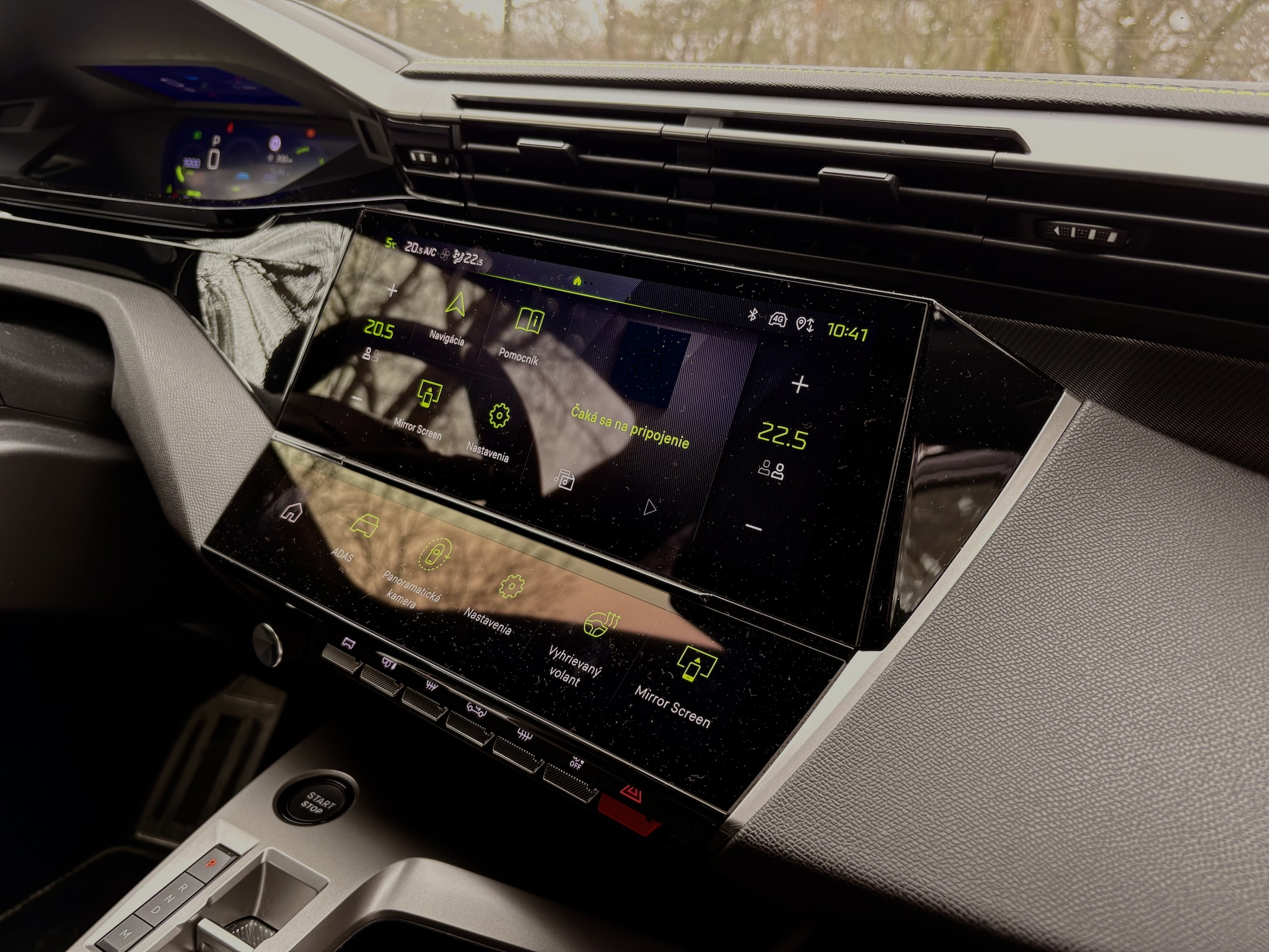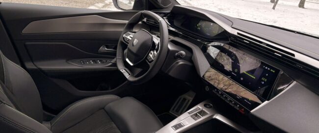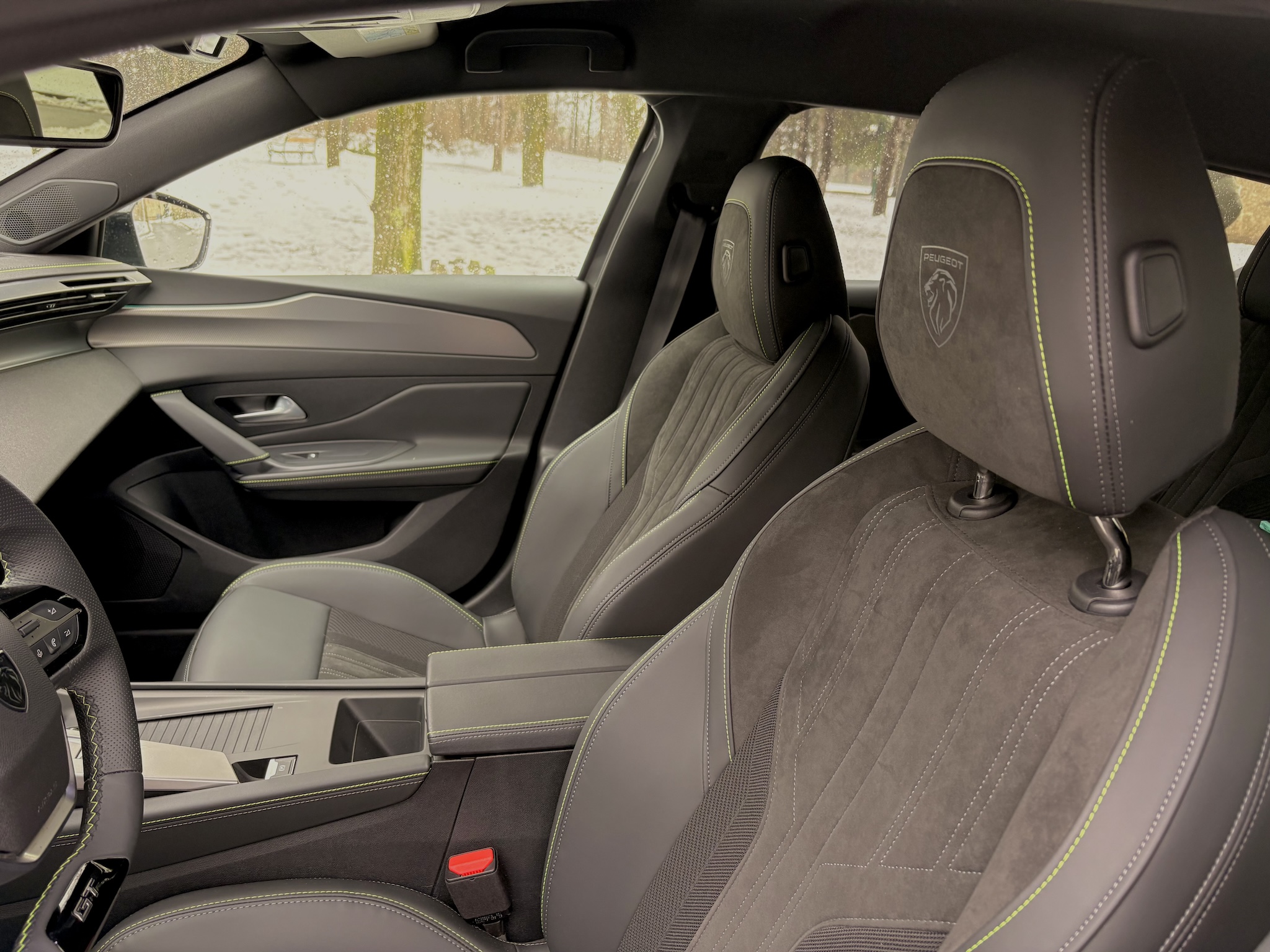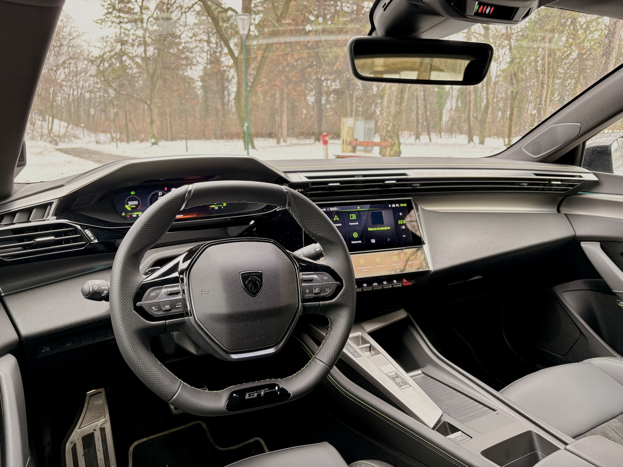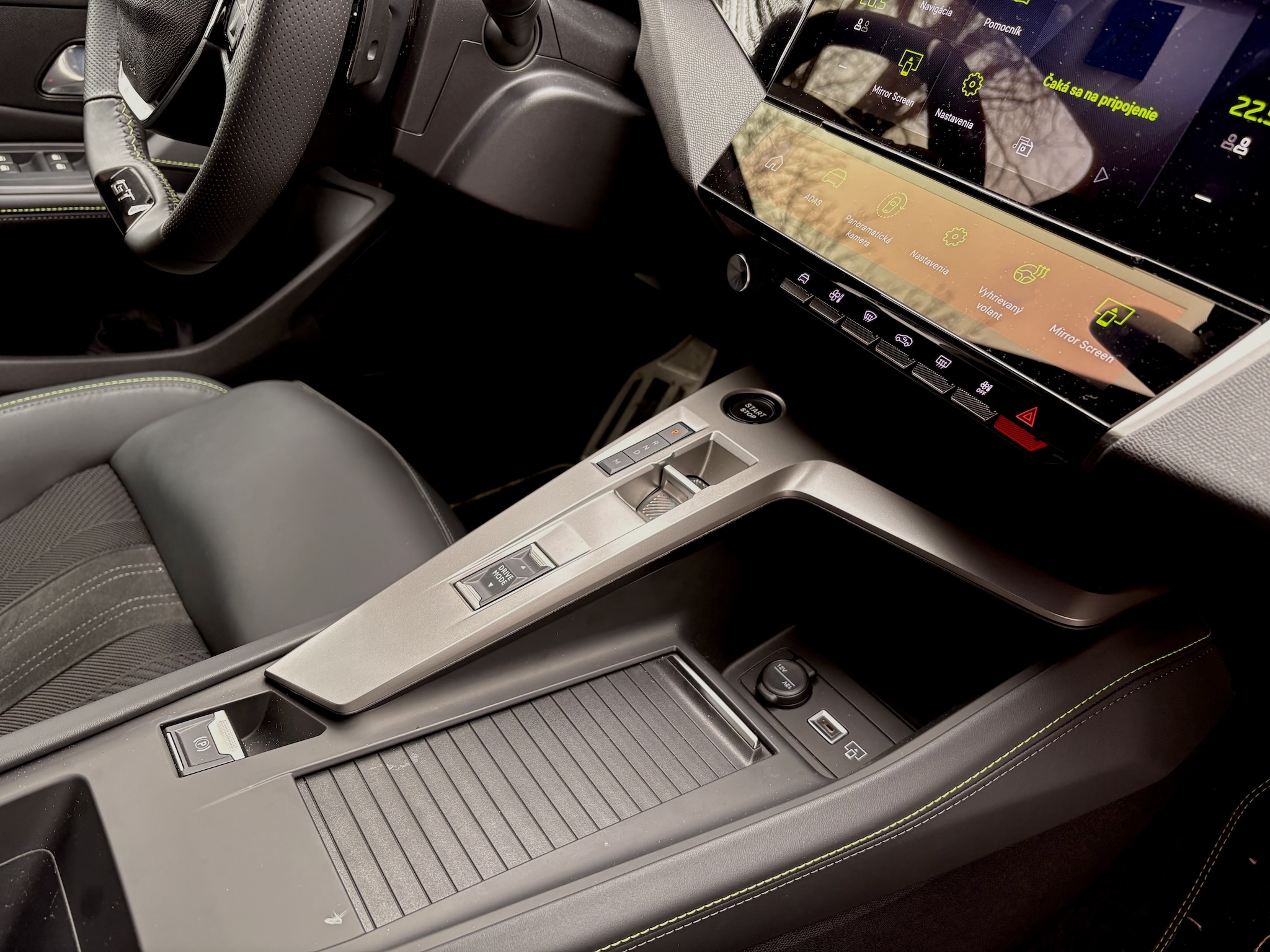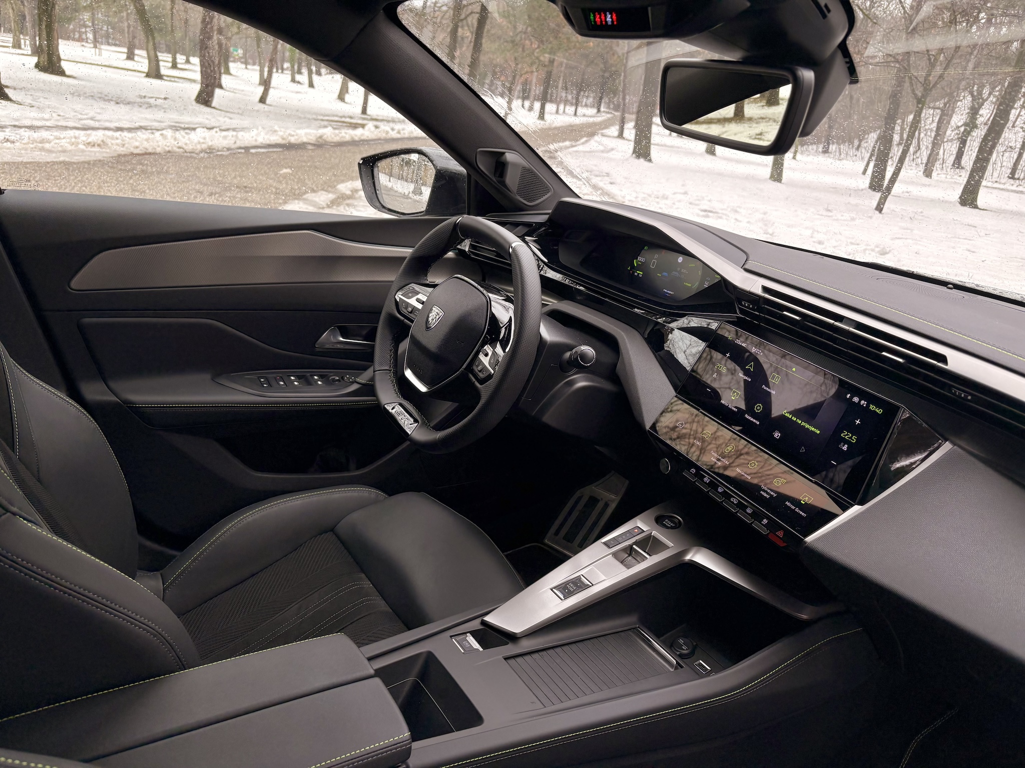 V kabíne si na prvý pohľad žiadne zmeny nevšimente, dôraz sa tu kládol skôr na vylepšenia materiálov a technológií. Tak napríklad sedadlá majú ortopedický certifikát AGR a nastaviteľnú prednú časť sedáku. Sedí sa v nich výborne, čo sa tuhosti aj bočného vedenia týka a aj subtílnejším postavám poskytnú veľmi slušnú oporu. Materiálový dojem je tak celkovo výborný, plasty na najviach exponovaných a vidteľných miestach sú mäkké a kvalitné. Posed je nízky a športový, s tradične malým dvojramenným vyhrievaným volantom a i-Cockpit architektúrou reprezentovanou dvojicou 10″ displejov. Oba displeje majú decentú grafiku a svižné reakcie, infotainment má aj vstavanú navigáciu a samozrejme parkovacie kamery. Ovládanie je rýchle, na prvý pocit je ovládanie možno trochu menej prehľadné ale zvyknúť sa dá veľmi rýchlo. Naviac, 308 má programovateľné digitálne tlačidlá i-Toggles, kde si viete presne podľa svojich preferencií navoliť čo nimi chcete ovládať. Toto je veľmi užitočná pomôcka a dovolíme si tvrdiť, že dôstojná a v mnohých ohľadoch aj lepšia alternatíva k kardvérovým ovládačom. Smartfón nabijete bezdrôtovo, USB porty sú C a prevodovka má malú nenápadnú páčku zarovnanú do stredového tunelu. Ten má okrem iného aj zaťahovaciu roletku a pod ňou úložný priestor na nápoje a tiež otváraciu lakťovku. Prešívanie zelenou niťou je u nových Peugeotov už tak trochu klasika ale vôbec nevadí ani nepôsobí nepatrične, napriek tomu že ide o výrazný prvok, Nájdeme ho na volante, palubke aj sedadlách, ktoré sú potiahnuté eko verziou alcantary. Priestoro je 308 SW skôr priemerom a bežným zástupcom triedy, ktorý nevyniká pozitívne ani negatívne. Vpredu je miesta samozrejme dosť, kritickejšie to býva vzadu a v prípade 308 je to pre dve osoby úplne v norme, na kolená bez problémov, na hlavy trochu horšie, ak tu budú sedieť extra vysoké osoby. To je logické, keďže dynamicky nízka silueta karoséria sa vnútri musí prejaviť. Do kufra ale zbalíte solídnych 598 litrov.
