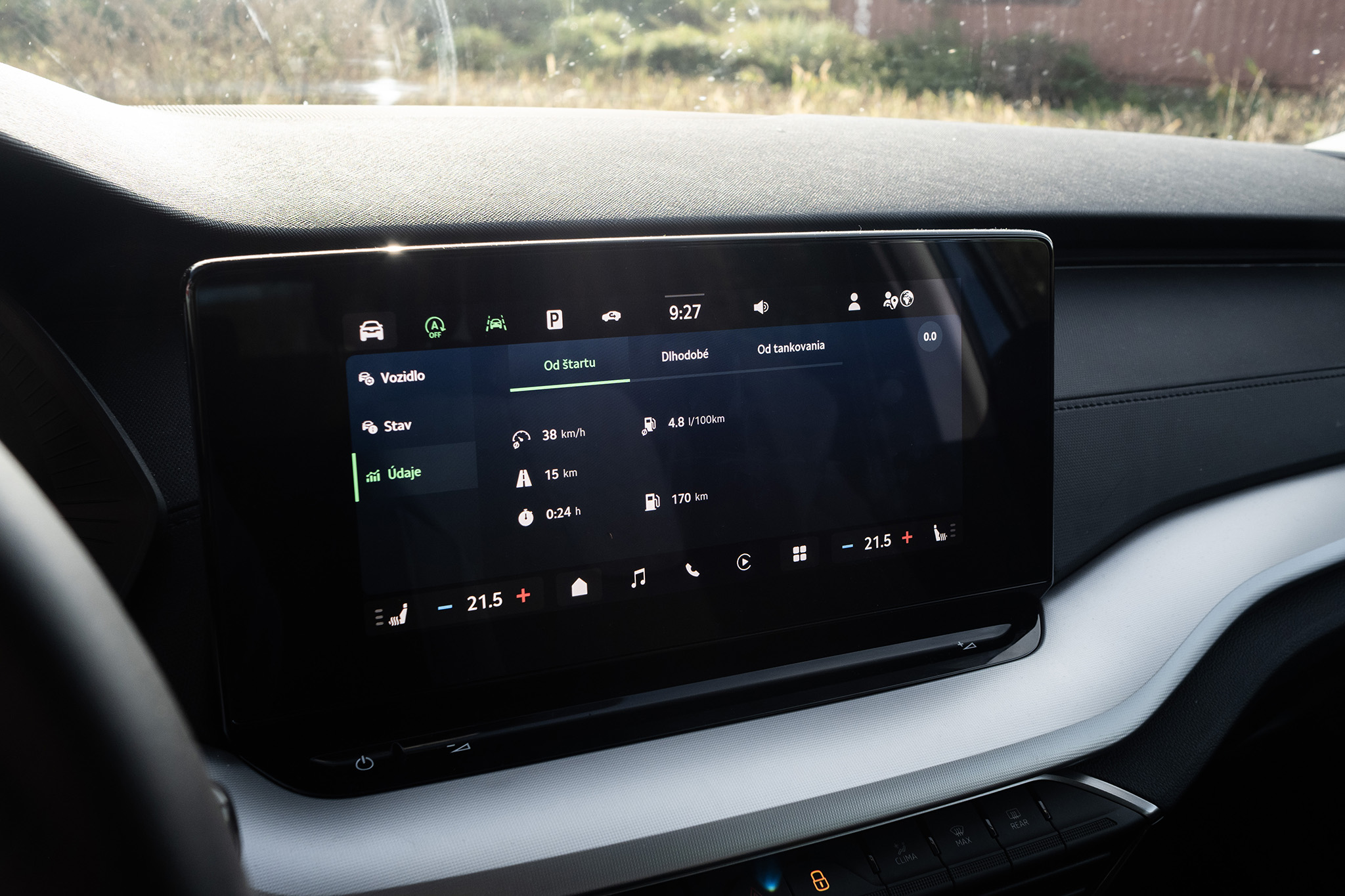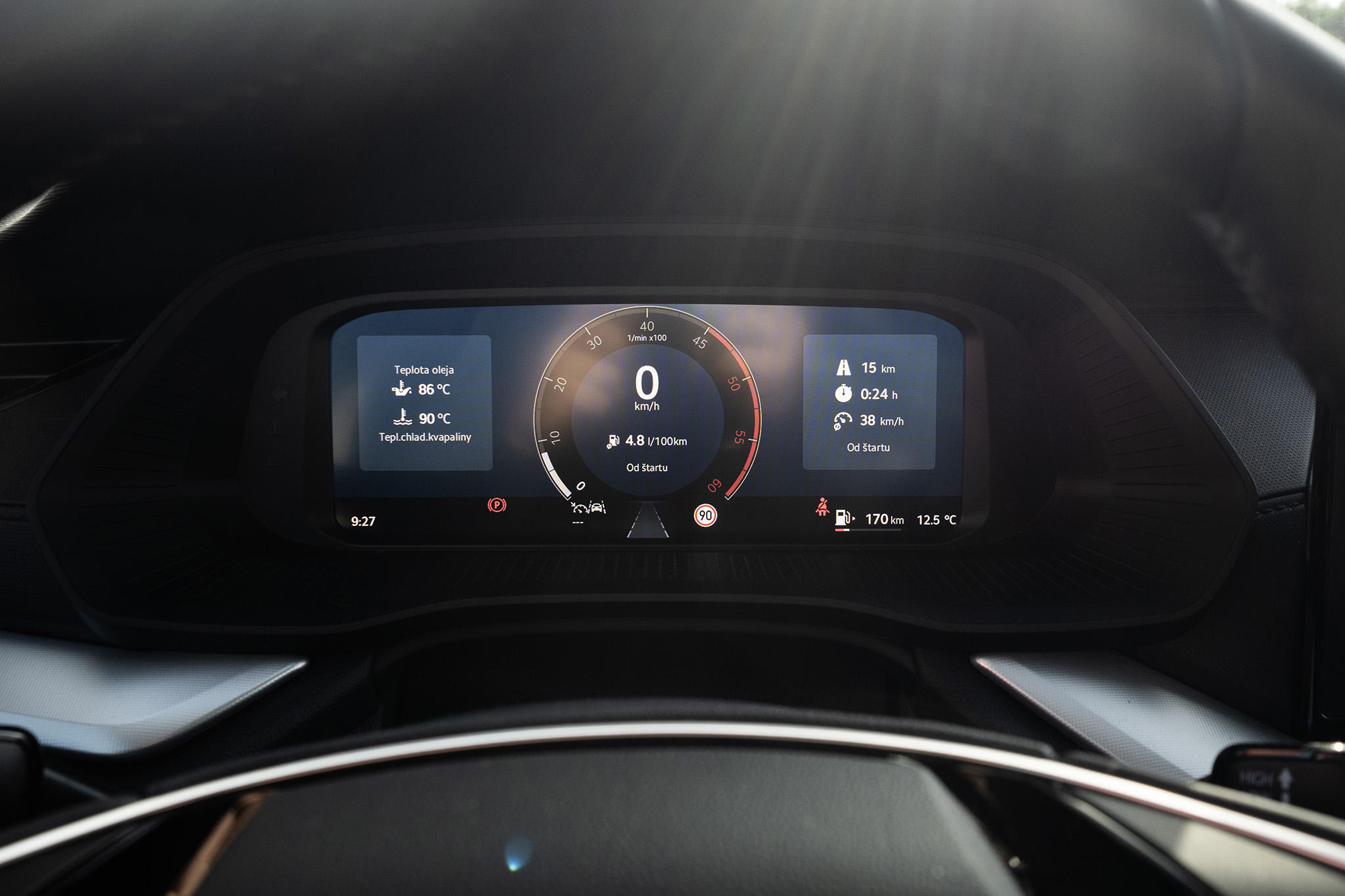 Ďalším bodom, kde vidno, že toto je lacnejšie prevedenie, je displej pred vodičom. Ten vyzerá jednoducho až príliš jednoducho. Nečakajte žiadne pokročilé funkcie, máte na výber, či chcete čisto digitálne zobrazenie rýchlosti, alebo môžete mať aj simulovanú analógovú mierku otáčok a rýchlosti. Vlastne to stačí. Dôležitejšie je, že vidíte informácie o spotrebe a dojazde. Tieto dve veličiny vám dokážu vyraziť dych a povedať, že kedy máte na tej diaľnici zastaviť, aby ste prebytočnú naftu, ktorá sa produkuje v tejto fabrike na kolesách, vyliali.
