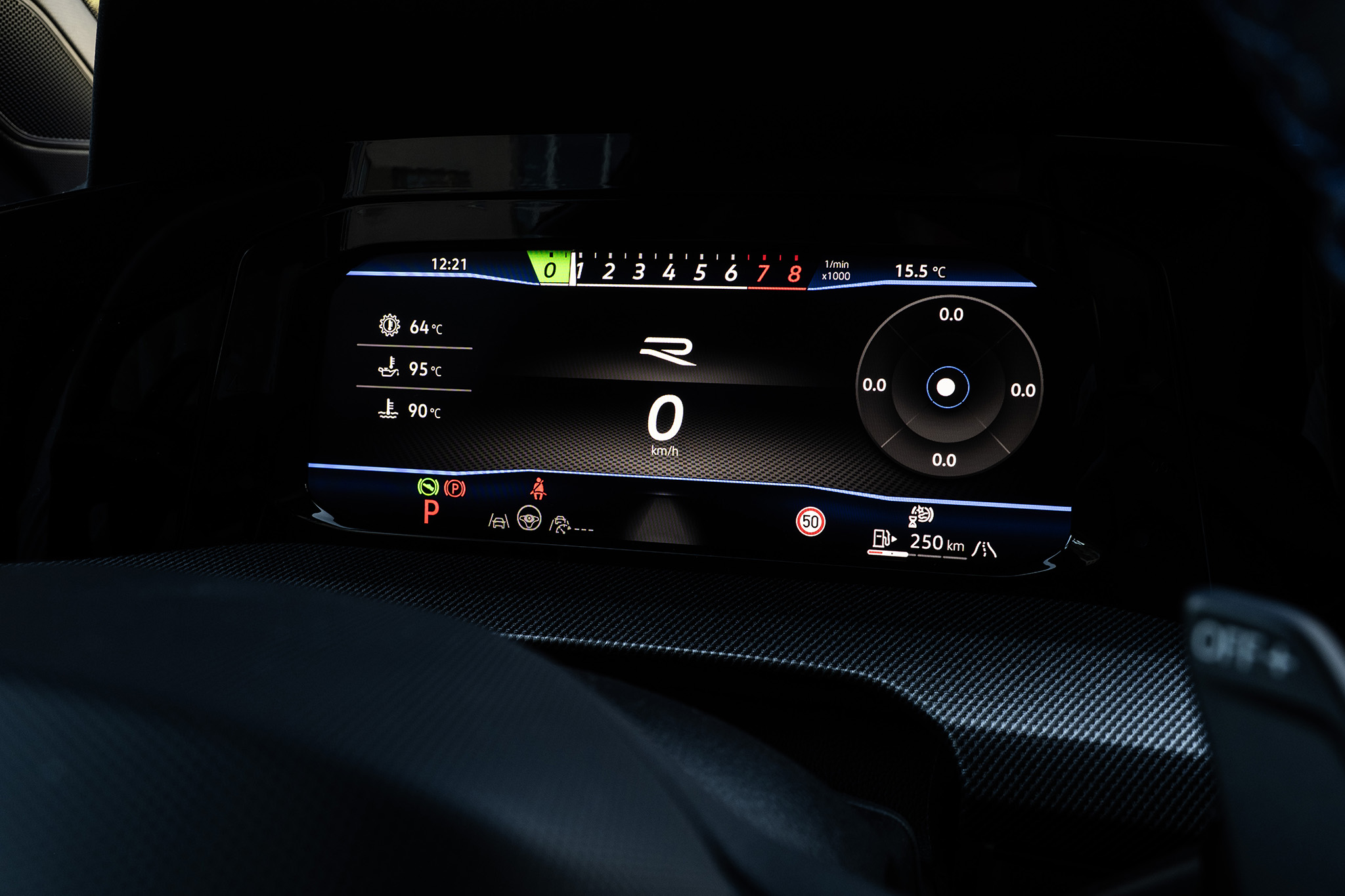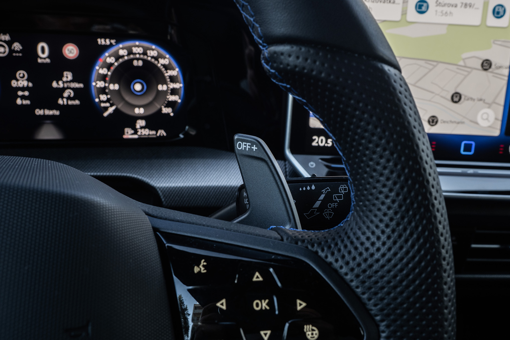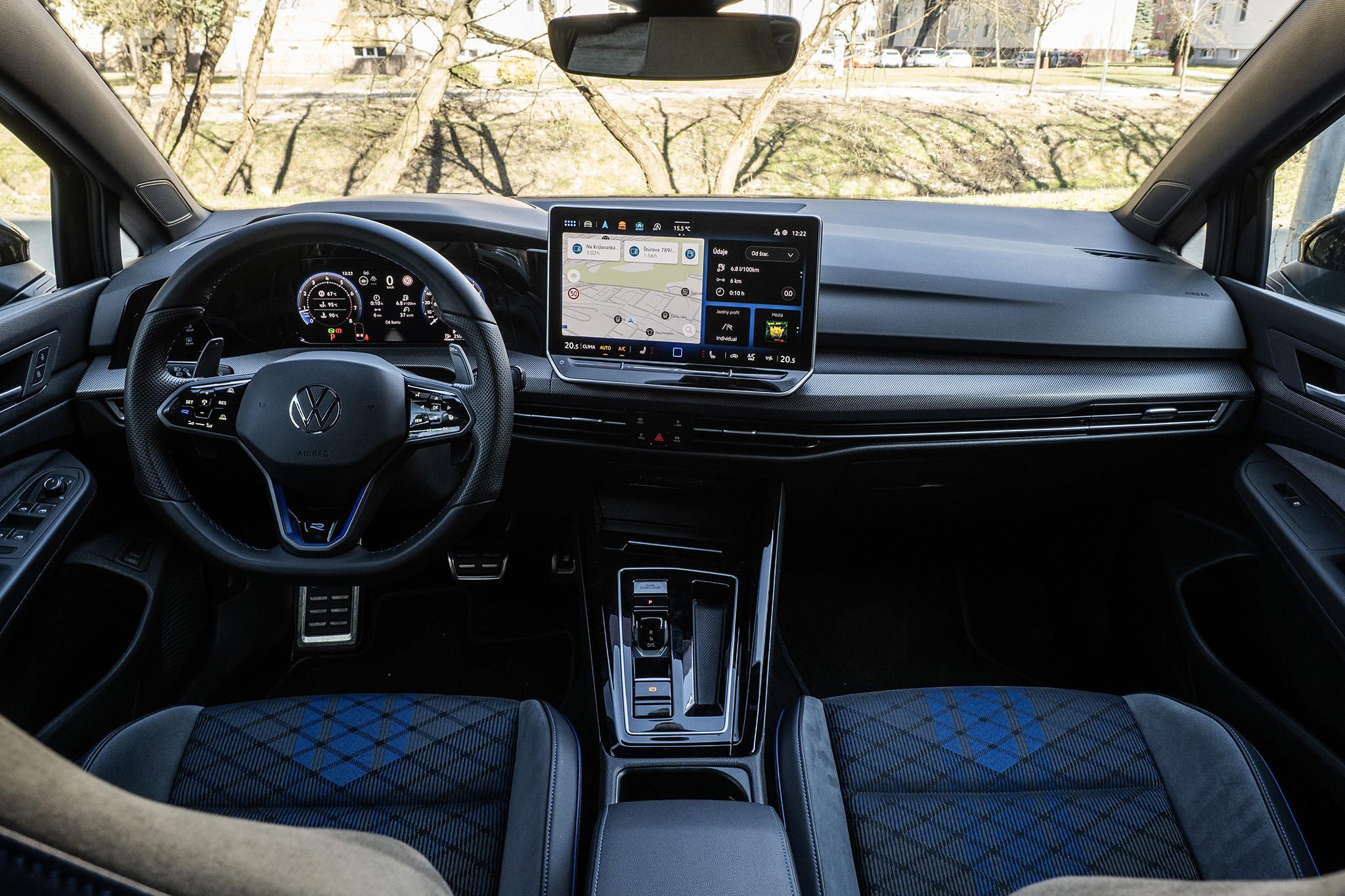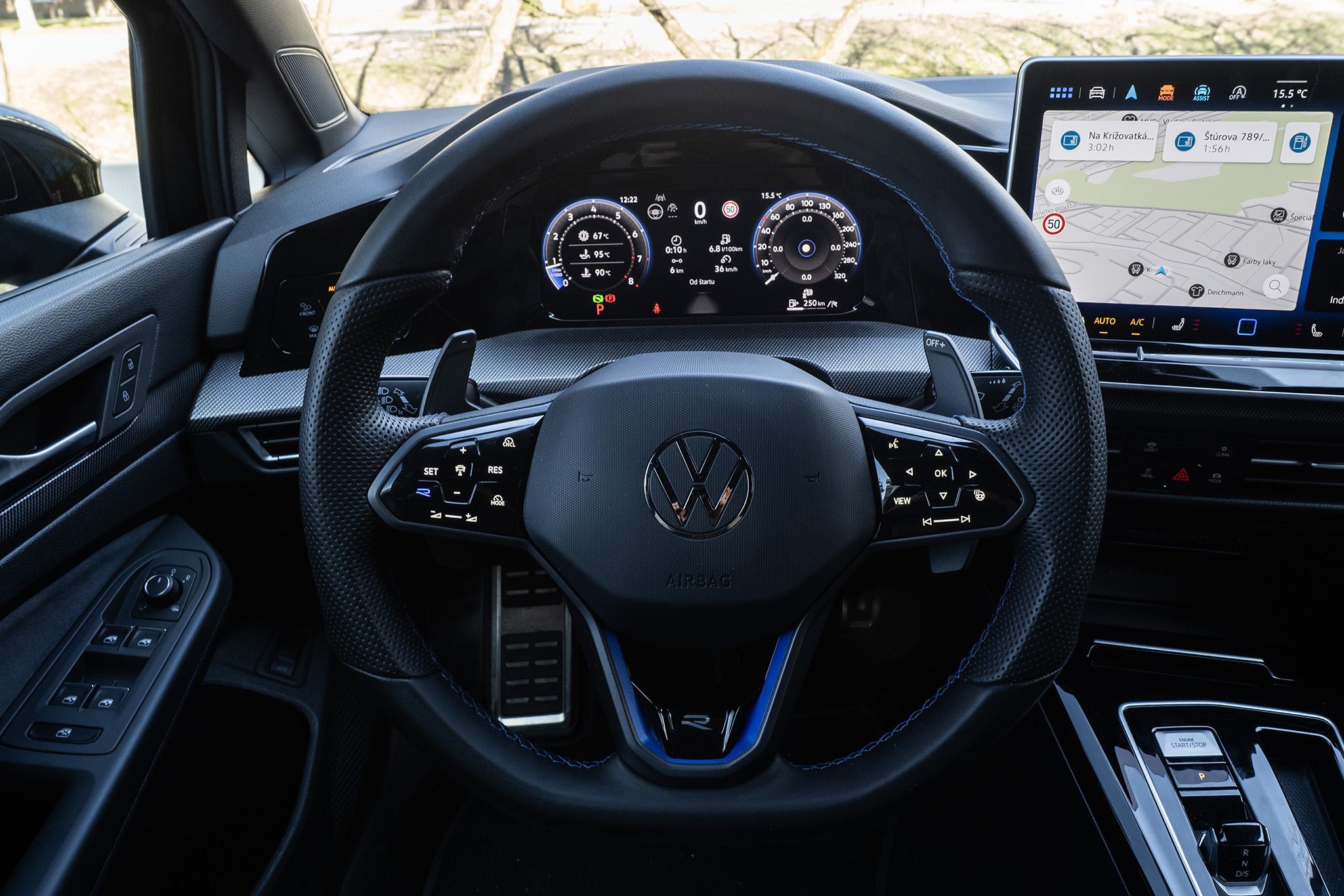 Chcel by som gombík na prepínanie režimov trocha inde ako pri tlačidle všetkých výstražných smeroviek, ale jedno tlačidlo s logom R je aj na volante. Toto je najväčšie prekvapenie. Volant má stále dotykové ovládanie, ktoré už mal Volkswagen opustiť. Zdá sa, že v elektrických autách a v Golf R ešte chvíľu ostane.